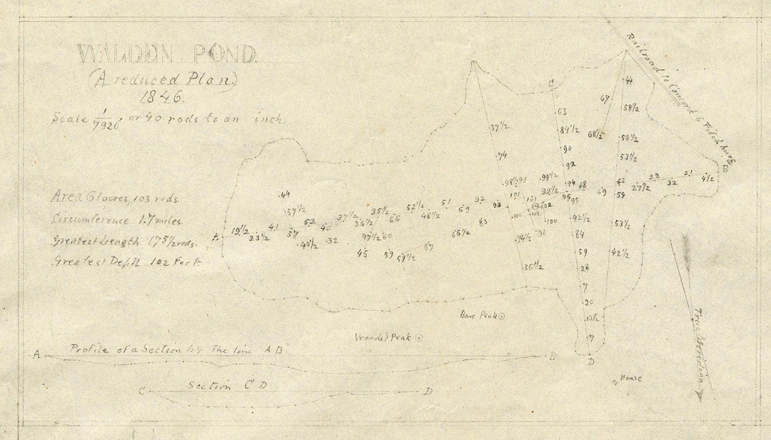 Original map of Walden Pond sketched by Henry David Thoreau and his notes made with the use of a pencil from his and his father's factory. source: New York Public Library and Concord Museum